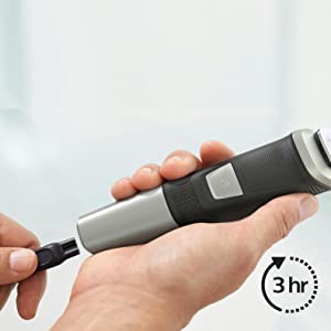 Pin sạc Lithium-ion mạnh mẽ cung cấp thời gian chạy lên đến 3 giờ cho mỗi lần sạc 1 giờ. Để thuận tiện hơn, tông đơ cũng có thể được sử dụng khi đang cắm điện.