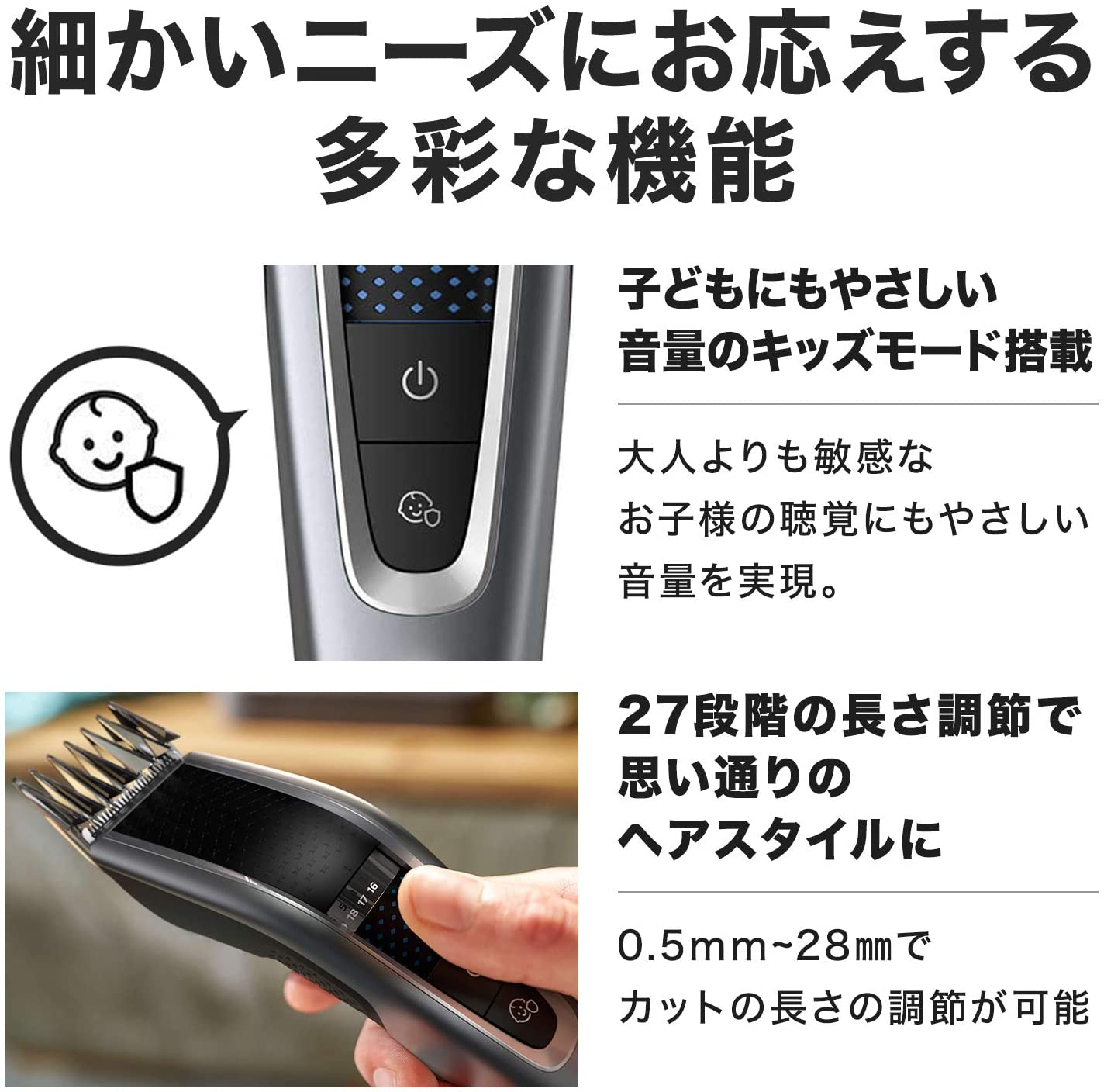 Chỉ cần xoay bánh xe vòng điều chỉnh cài đặt độ dài, chọn độ dài mong muốn và khóa nó lại. Hai lược điều chỉnh có thể được điều chỉnh theo gia số 1mm với độ dài cắt từ 3mm đến 28mm. Khi lược được tháo ra, có thể cắt tỉa 0,5mm.